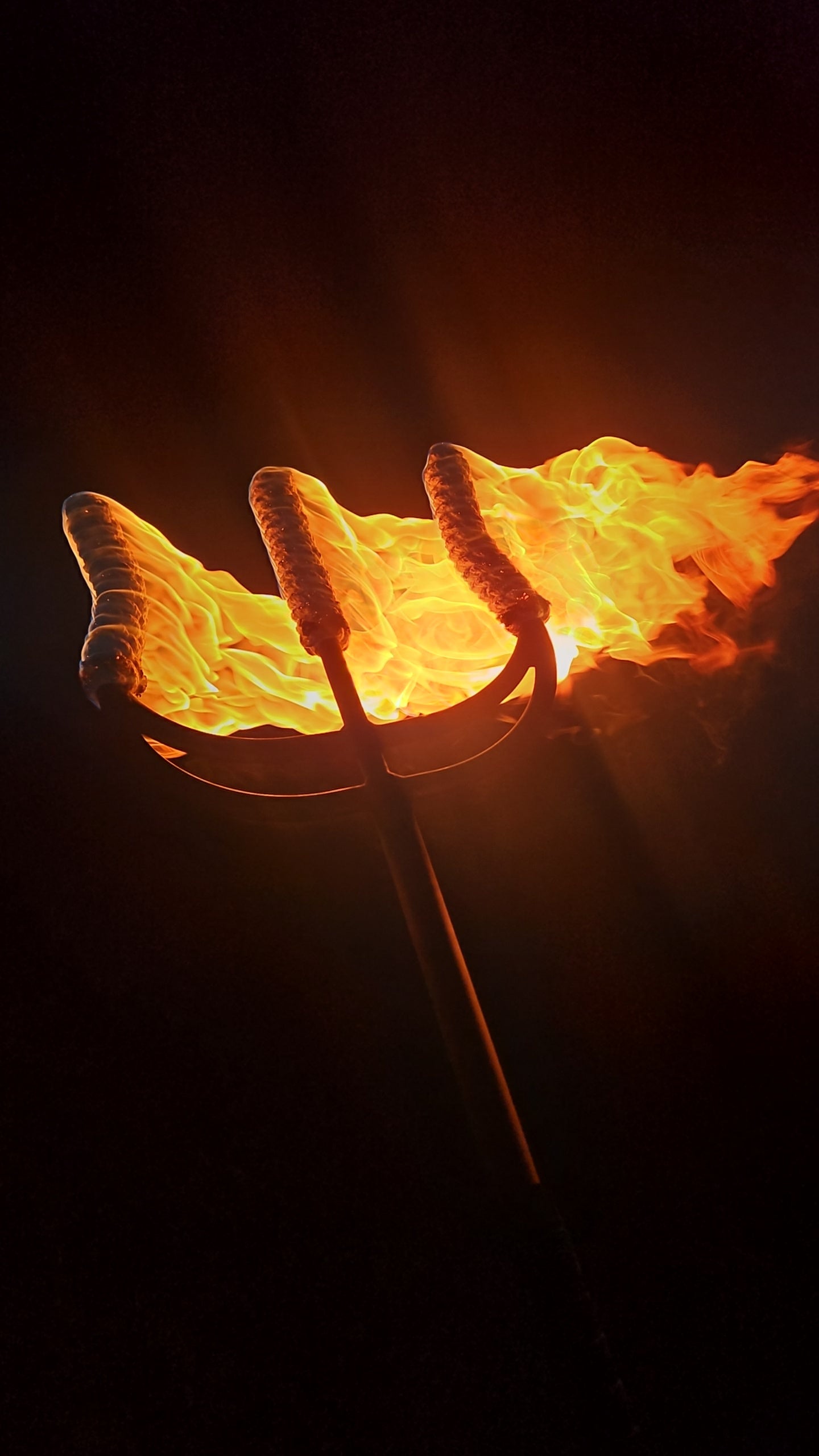 For the past year, I've immersed myself in the art of the Fire Trident, a mesmerizing discipline that marries the grace of the Dragon Staff with a fiery intensity. With its unique triple-pronged design, one end spins with a fierce intensity, while both ends blaze with the enchantment of fire. The Fire Trident's weight and deliberate pace give rise to a distinctive, unhurried flow, allowing for intricate rolls and mesmerizing movements that defy expectations. It's a captivating fusion of elegance and power that sets my performances ablaze with wonder